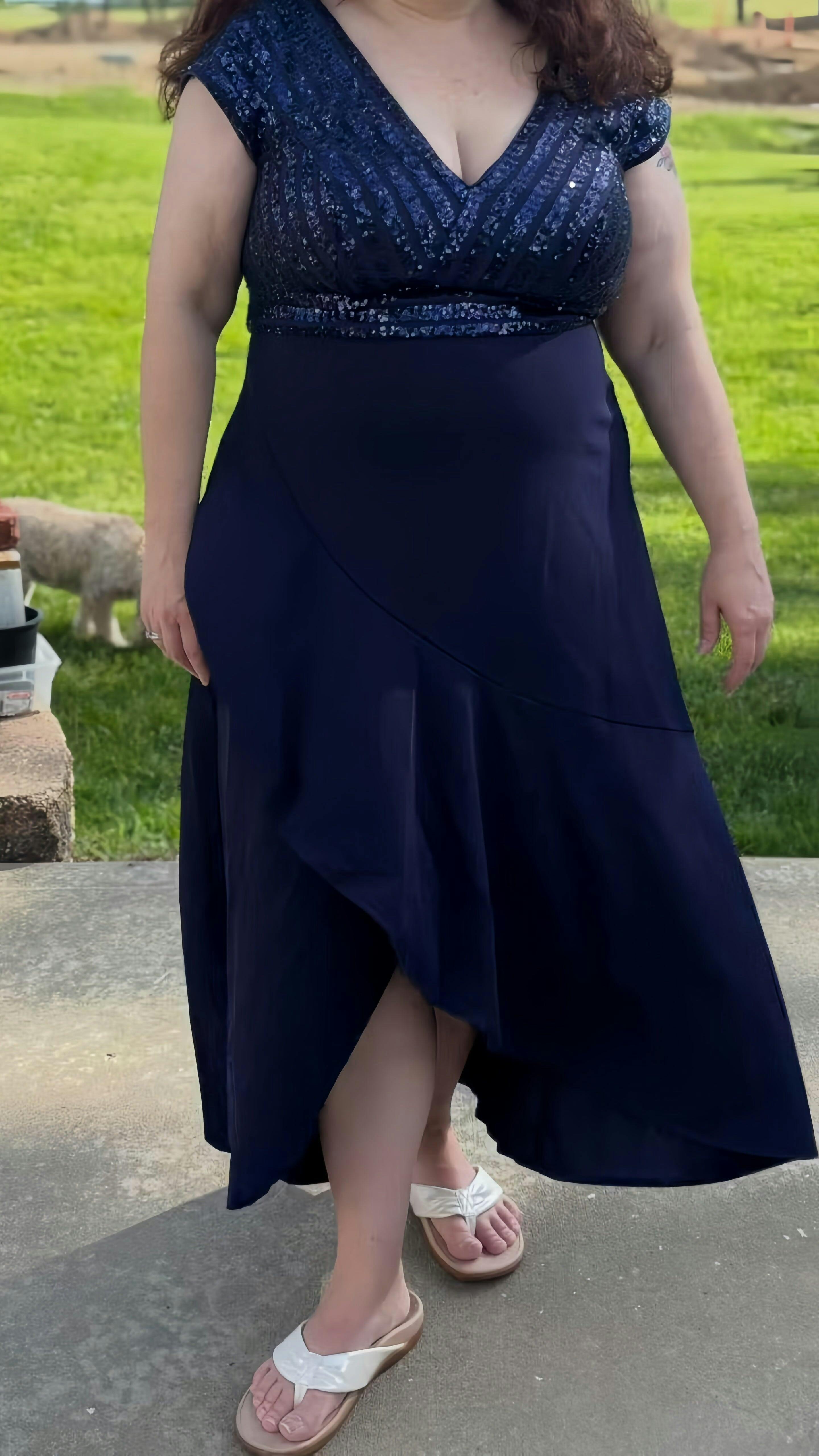 • The model is 5'7" (170cm), 160 lbs with measurements: (Bust 97cm, Waist 79cm, Hips 105cm, Hollow to hem 152cm). She is wearing a US 12 dress.
