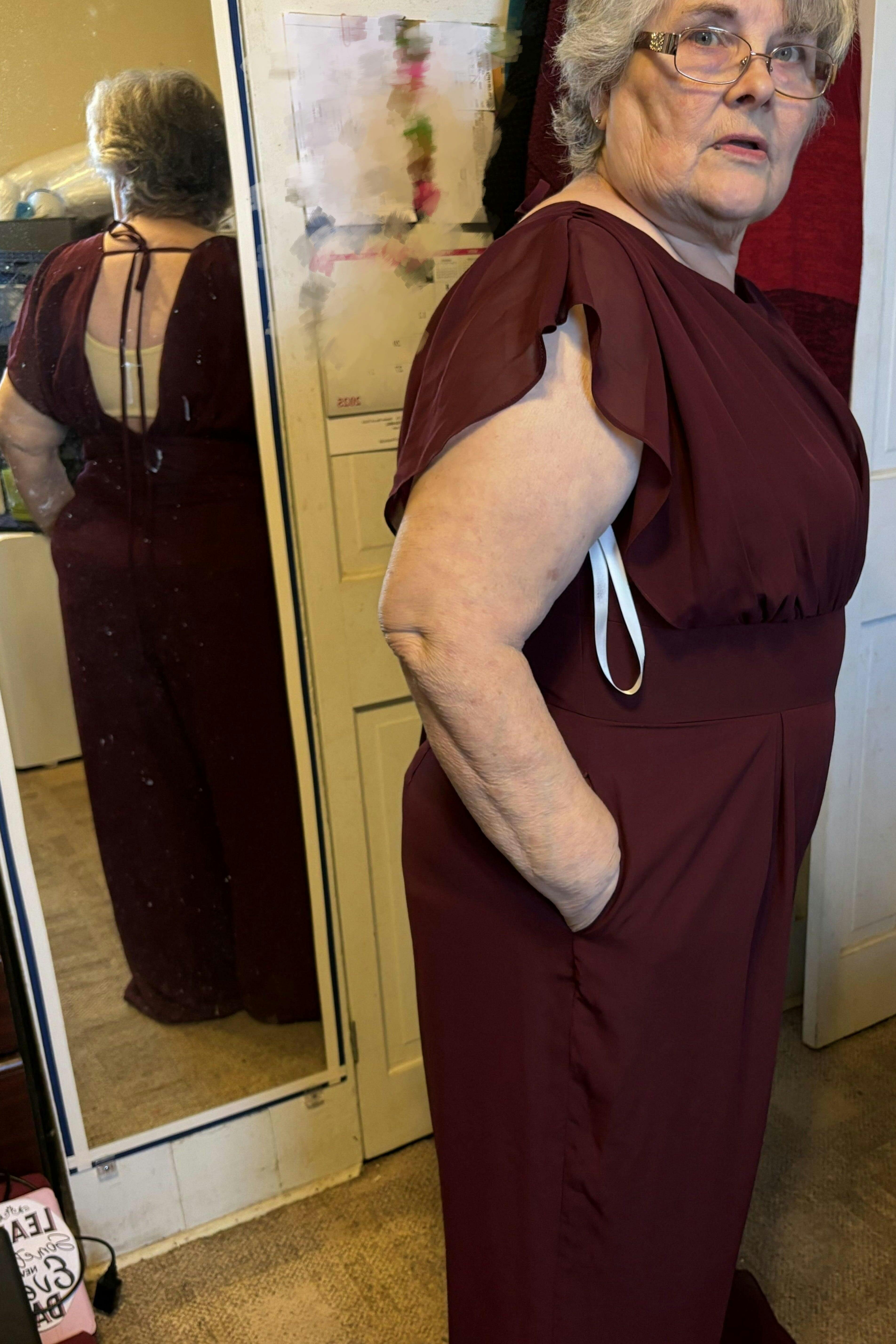 • The model is 5'7" (170cm), 160 lbs with measurements: (Bust 97cm, Waist 79cm, Hips 105cm, Hollow to hem 152cm). She is wearing a US 12 dress.