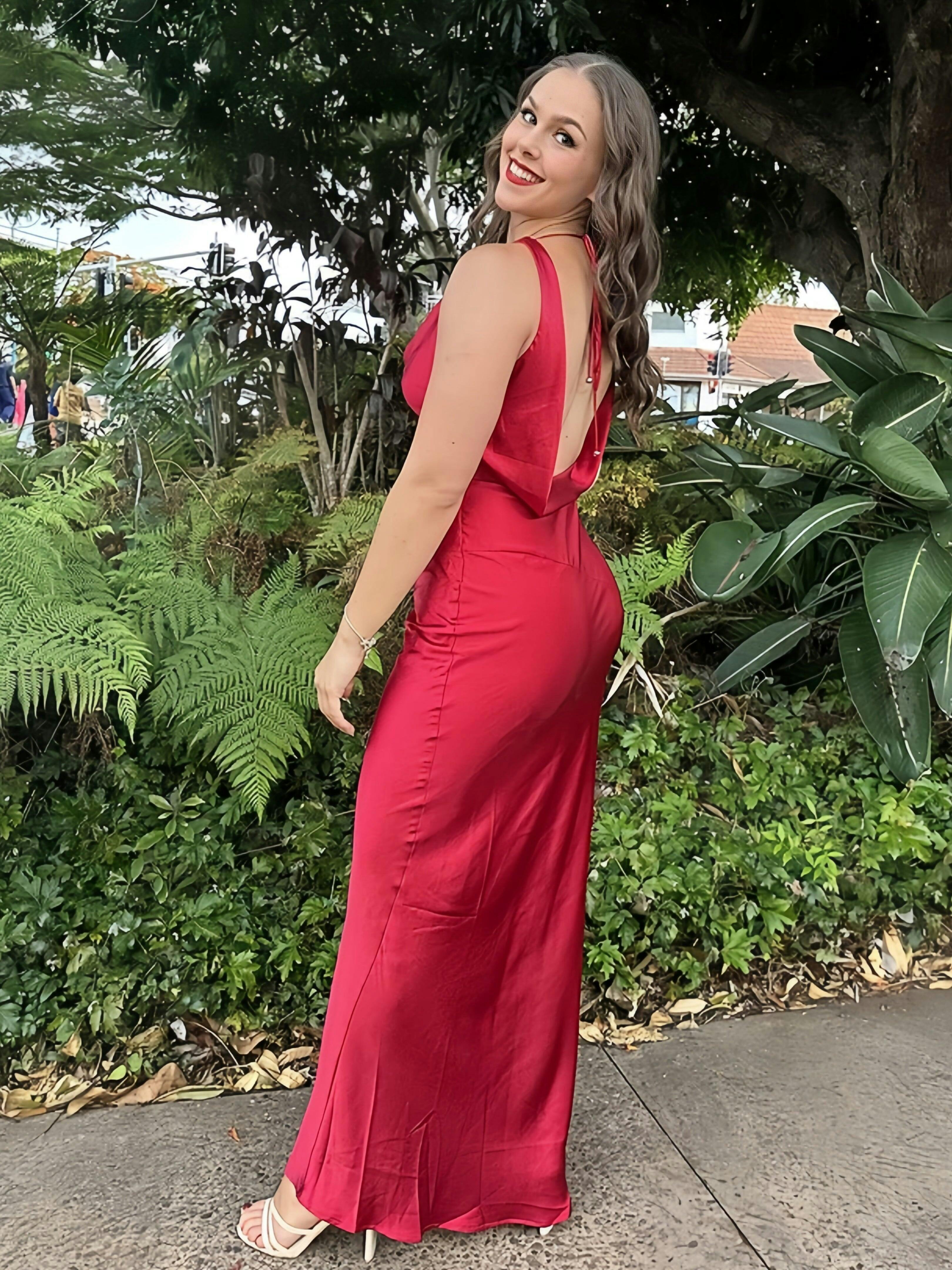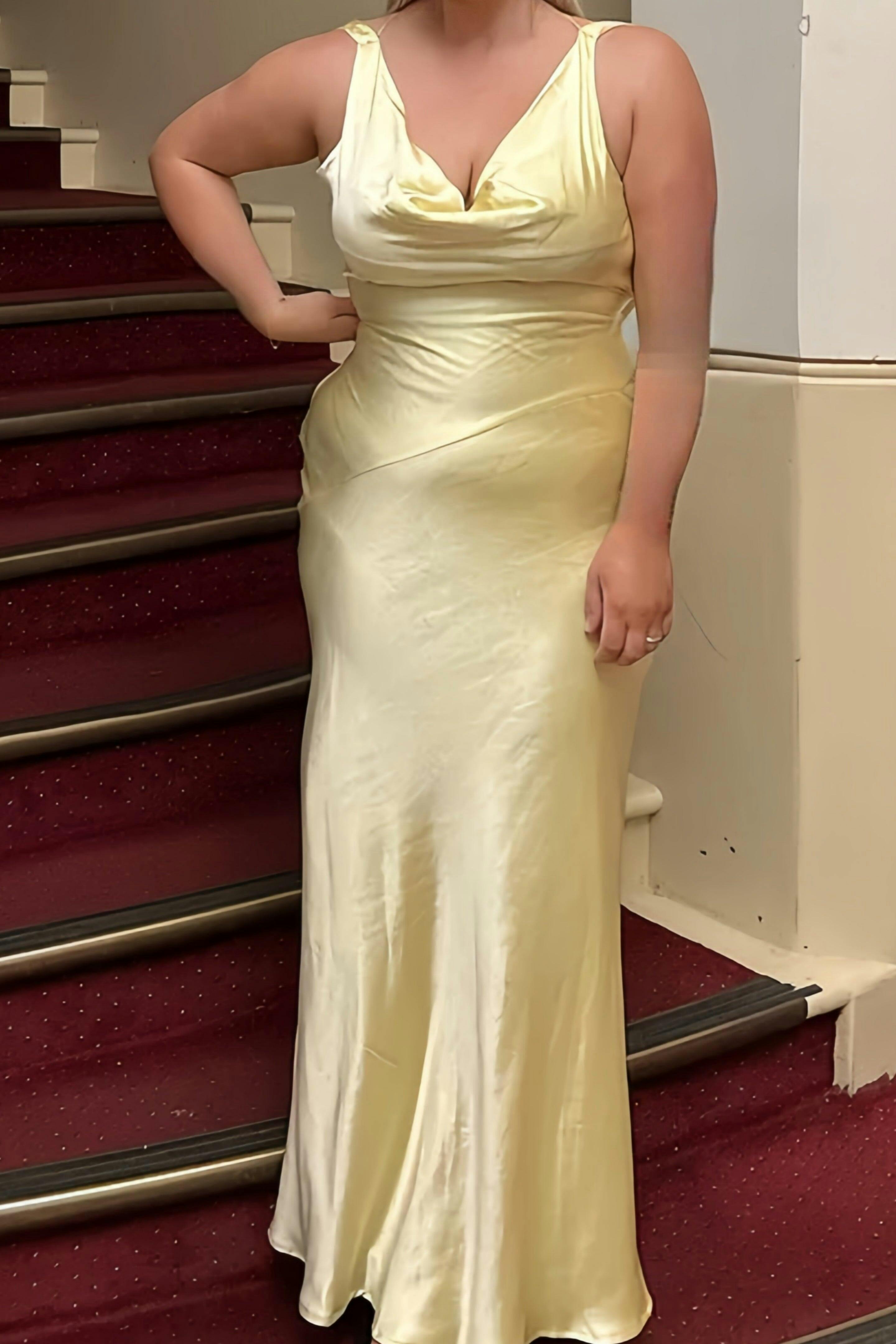 Sheath/Column Cowl Neck Sleeveless Ankle-Length Satin Backless Bridesmaid Dresses