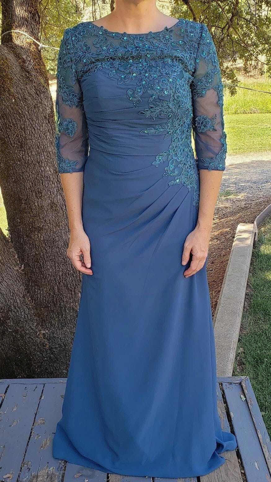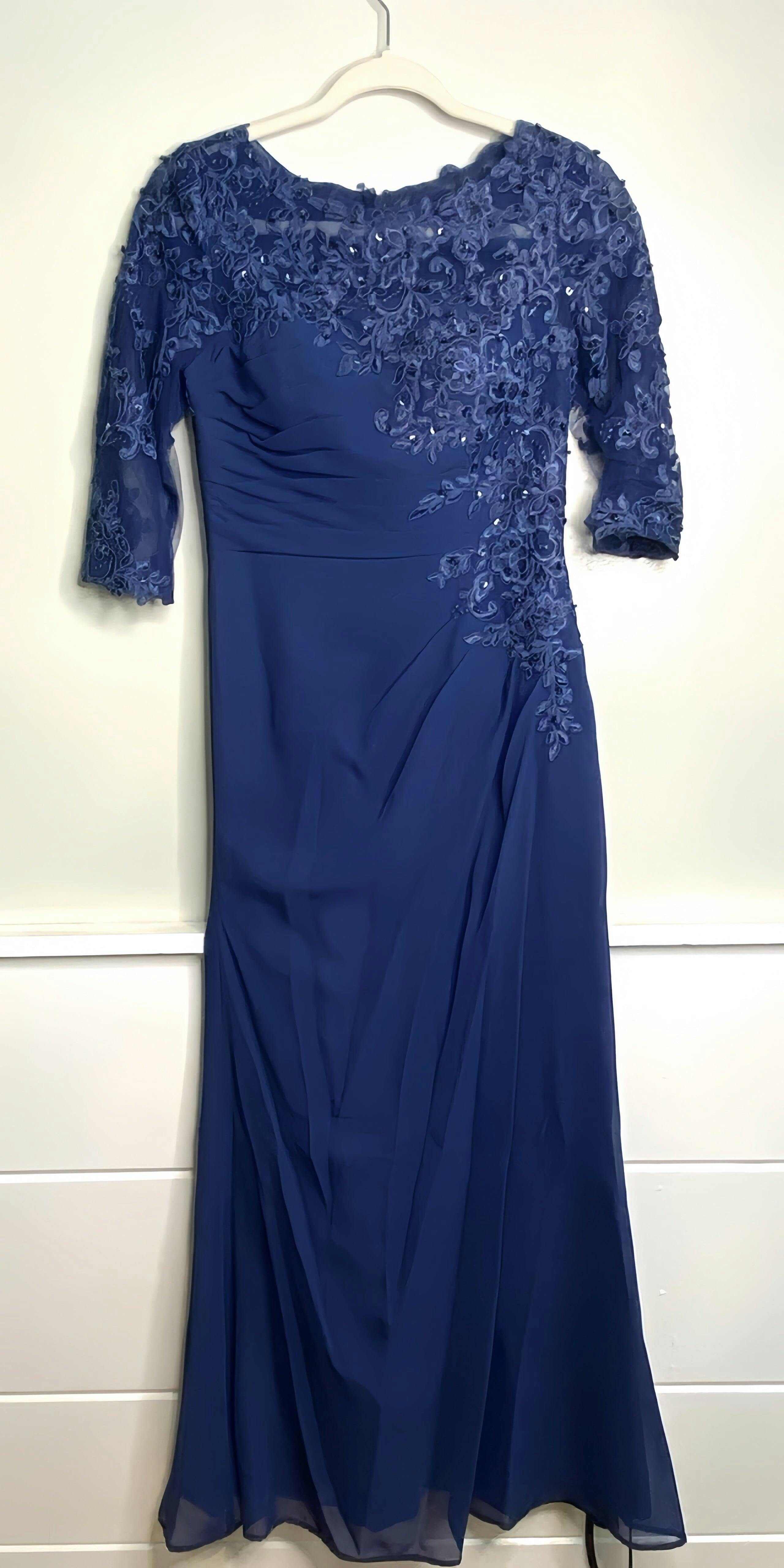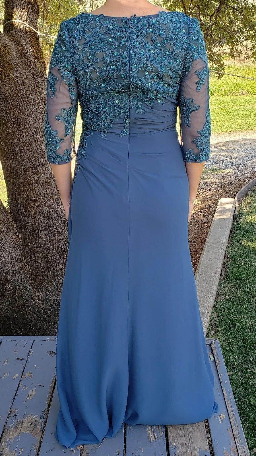 • The model is 5'7" (170cm), 160 lbs with measurements: (Bust 97cm, Waist 79cm, Hips 105cm, Hollow to hem 152cm). She is wearing a US 12 dress.