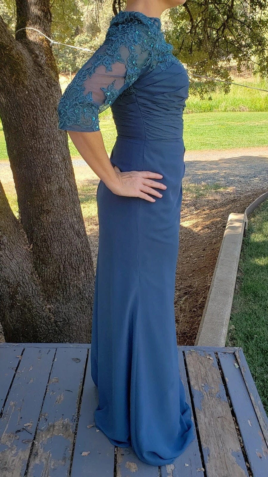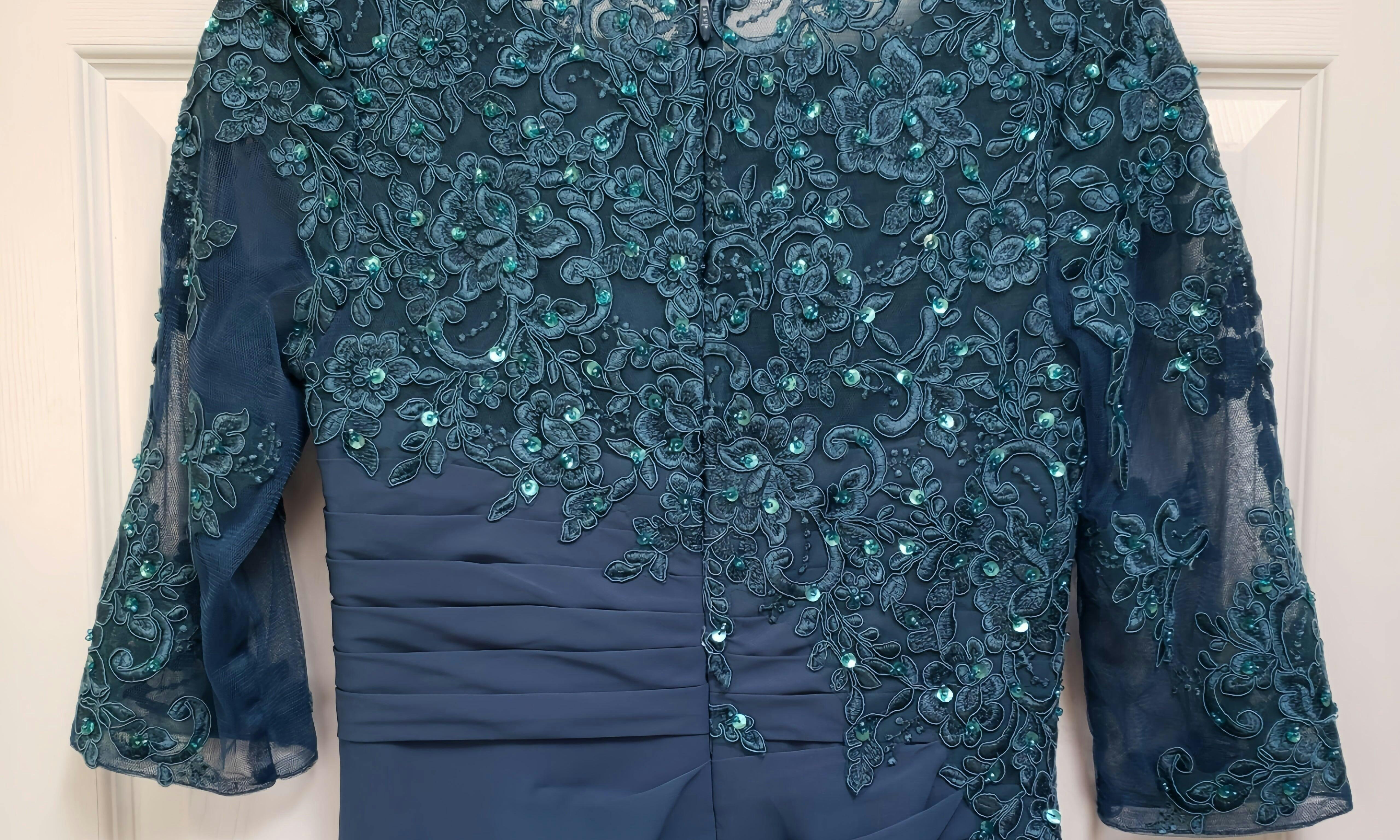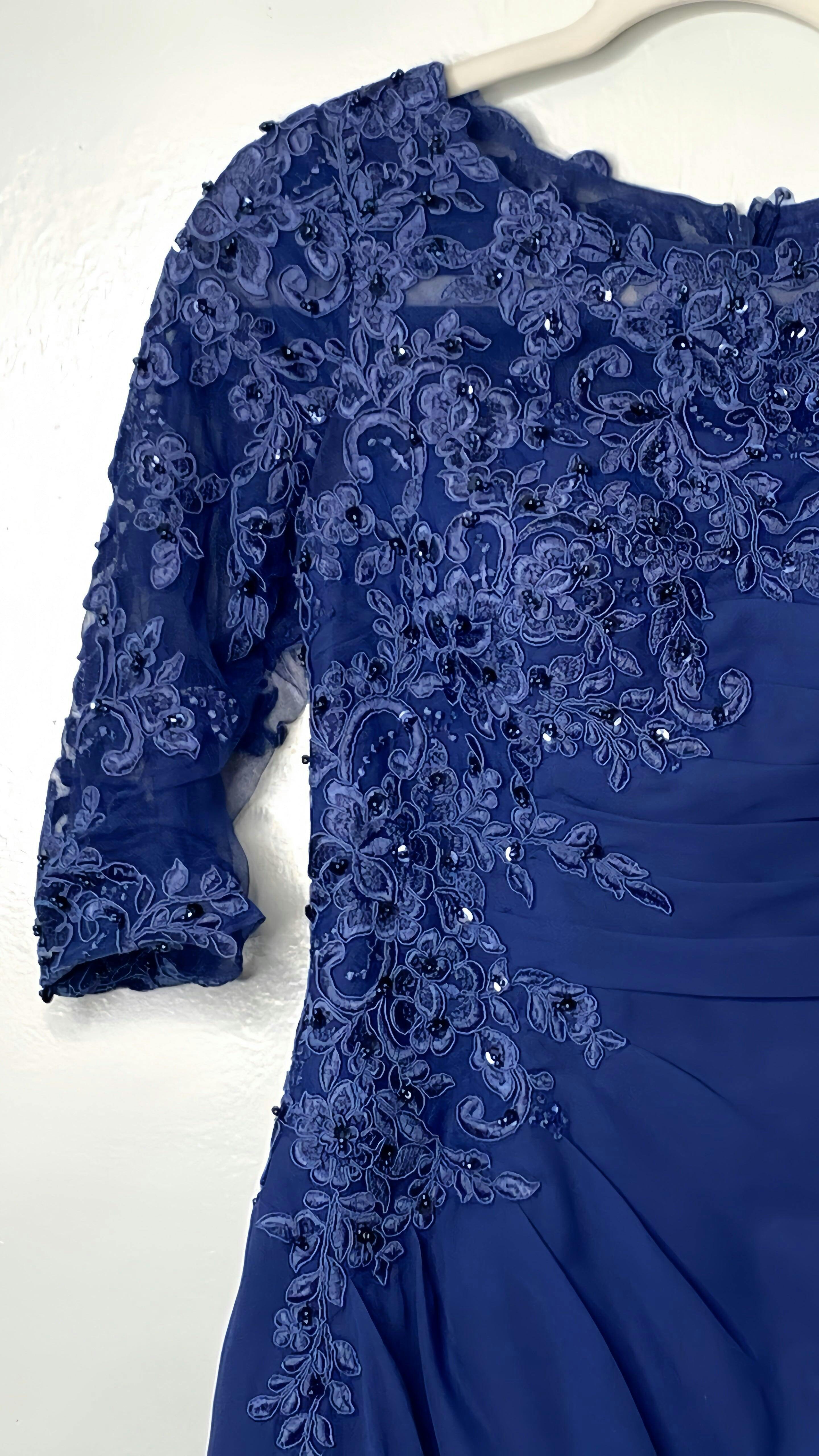 • The model is 5'7" (170cm), 160 lbs with measurements: (Bust 97cm, Waist 79cm, Hips 105cm, Hollow to hem 152cm). She is wearing a US 12 dress.