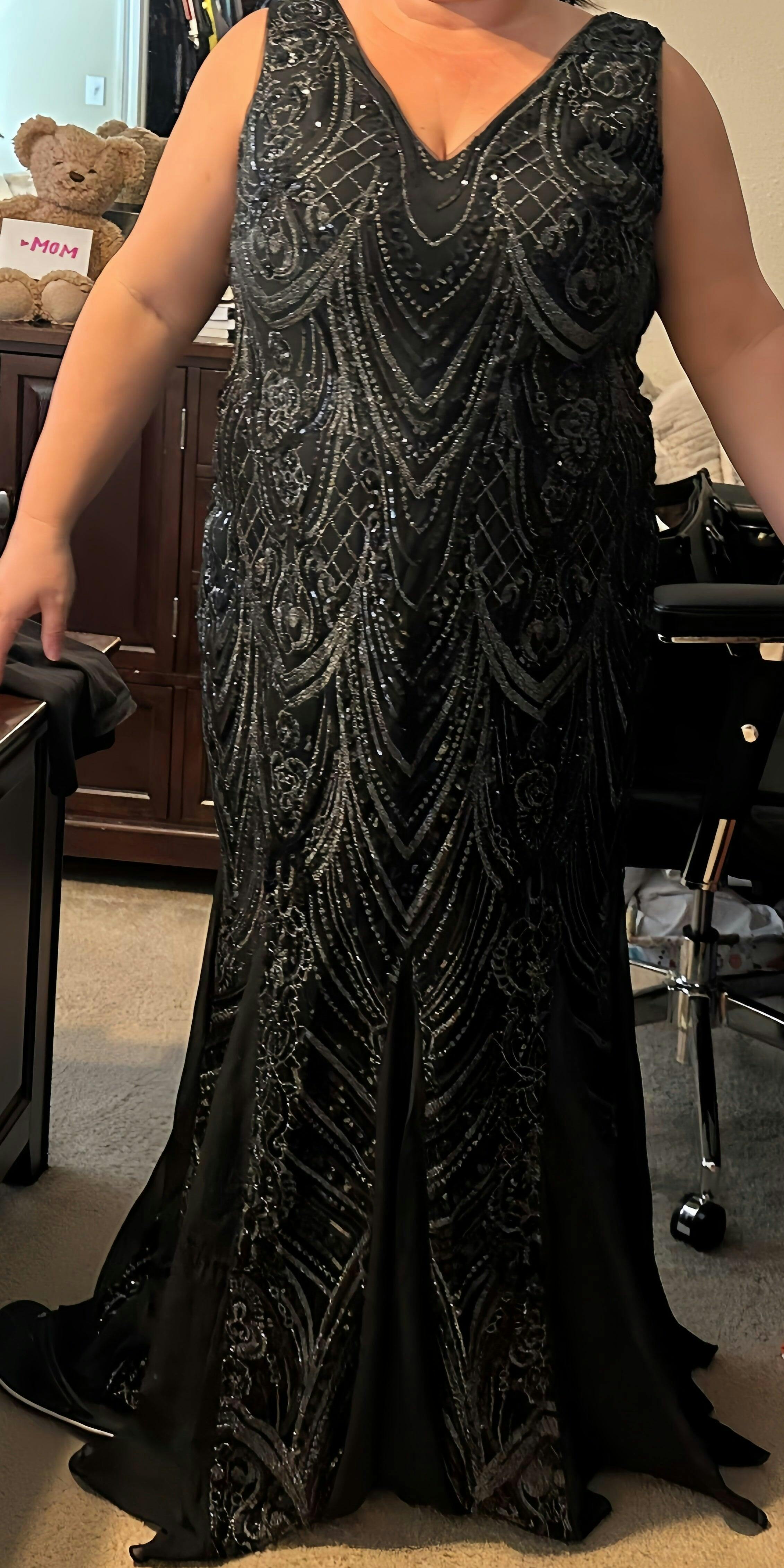 • The model is 5'7" (170cm), 160 lbs with measurements: (Bust 97cm, Waist 79cm, Hips 105cm, Hollow to hem 152cm). She is wearing a US 12 dress.